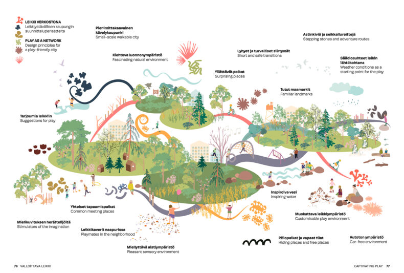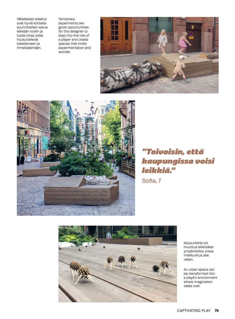 The city through a child’s eyes is a different world – a landscape of play, movement, and discovery. A city that works for children, however, works for everyone; it is accessible, pleasant, and safe. A child-friendly city is built on the idea that children are not just future adults, but active citizens of the present. Alku is written for adults: users of urban environments, designers, and developers. We hope it provokes thought, but above all, inspires action. This book is just the beginning – an invitation to continue the conversation and to develop child-friendly design together.