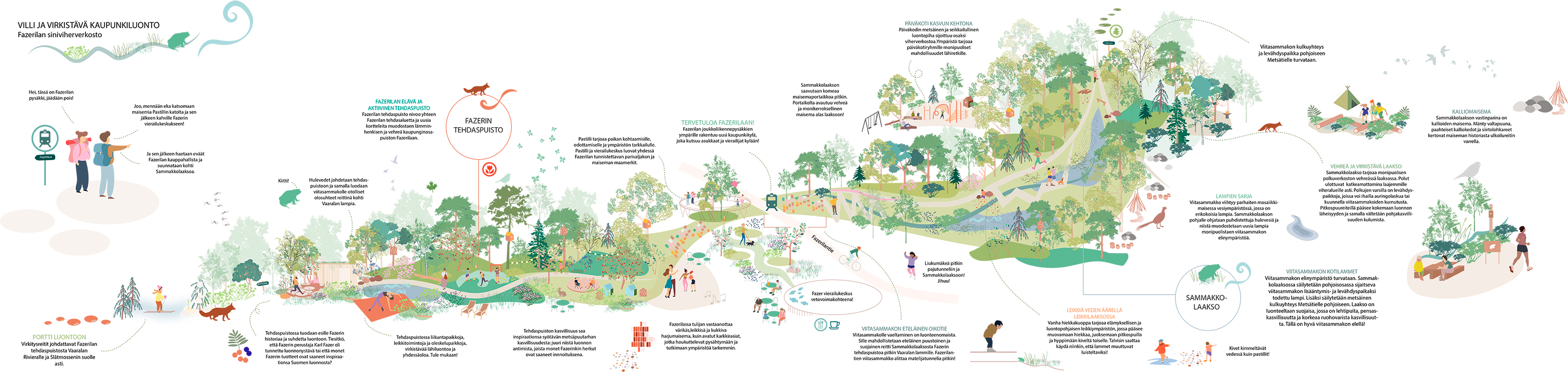 Avec envisions the future Fazerila-Santamalmi as a tasty and relaxed city district, where Fazer factory heritage and Santamalmi’s sand eskers with their anthropogenic changes are combined in an experiential way with the new residential environment. The blue-green network of diverse park areas is the backbone of the new tram city. The habitats of the moor frog (Rana arvalis) will be preserved and diversified as part of the adventurous Sammakkolaakso (frog valley) park. In the proposal, lush, green vegetation is paired with shapes and colours of the candy world.