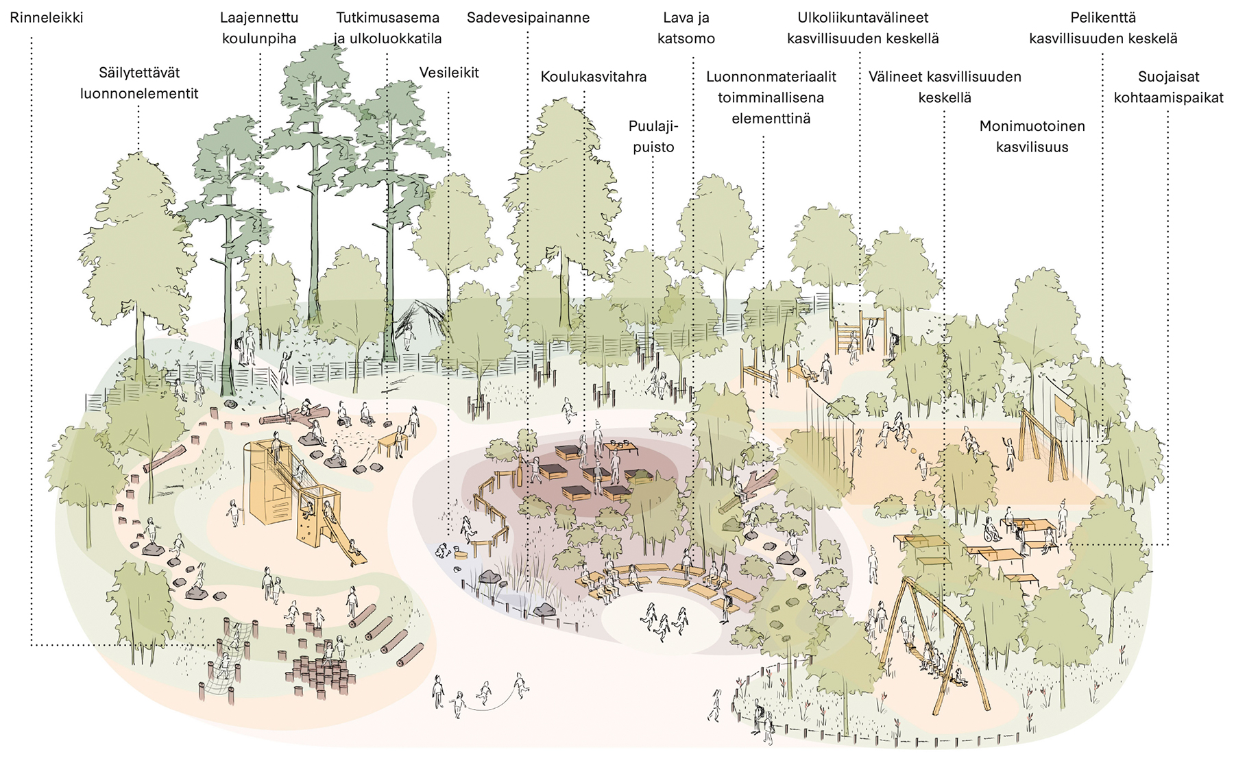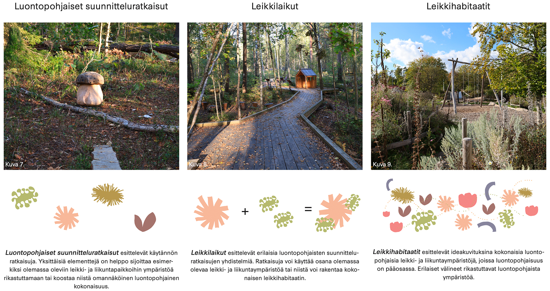 Luonto ja luontopohjaiset elementit antavat lukemattomia mahdollisuuksia lasten monipuoliseen leikkiin ja liikkeeseen. Tiedetään, että luontokosketuksella on tärkeä rooli lasten hyvinvoinnissa ja kehityksessä. Luomalla luontopohjaisia leikki- ja liikuntapaikkoja, saadaan aikaan ympäristöjä, jotka tuottavat sekä hyvinvointia lapsille että vehreää, luonnoltaan monimuotoista ja ilmaston muutokseen sopeutuvaa ympäristöä. Sekä lapsilähtöisyydessä että luontopohjaisuudessa on katse kohti kestävämpää tulevaisuutta.